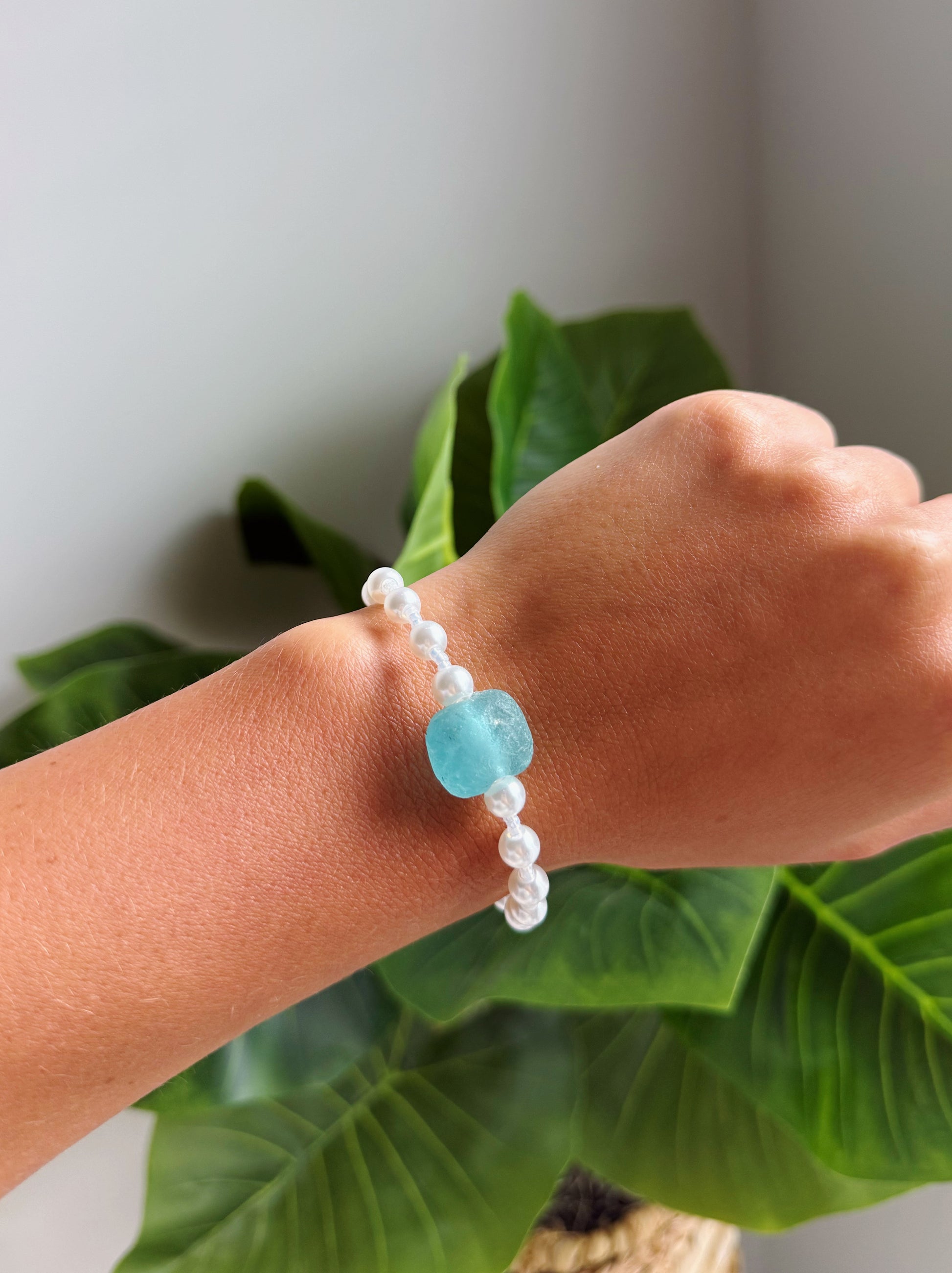 Clear Turquoise Sea Glass Pearl Bracelet