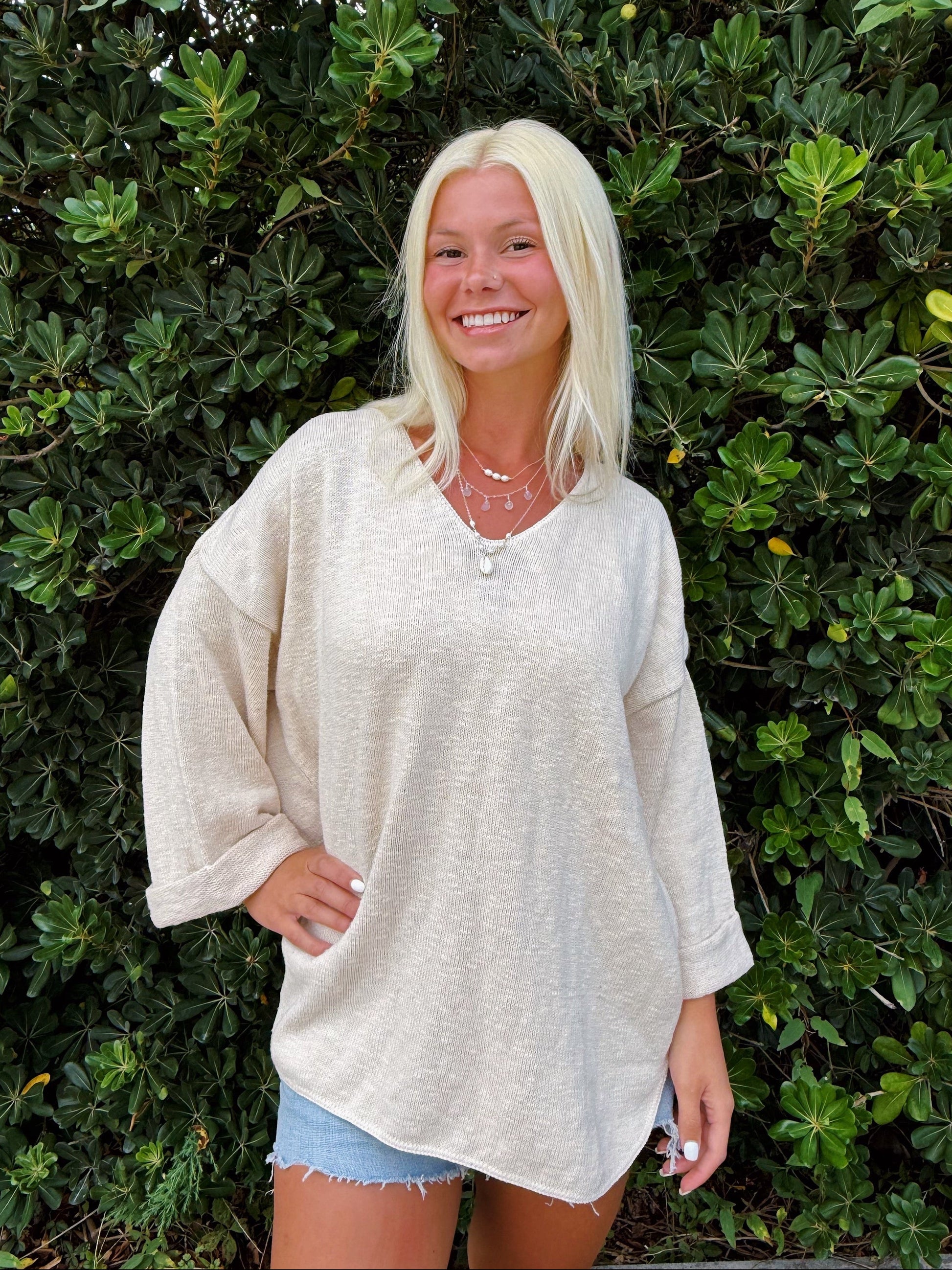 Oversized v neck sweater with drop shoulder sleeves & wide folded cuffs