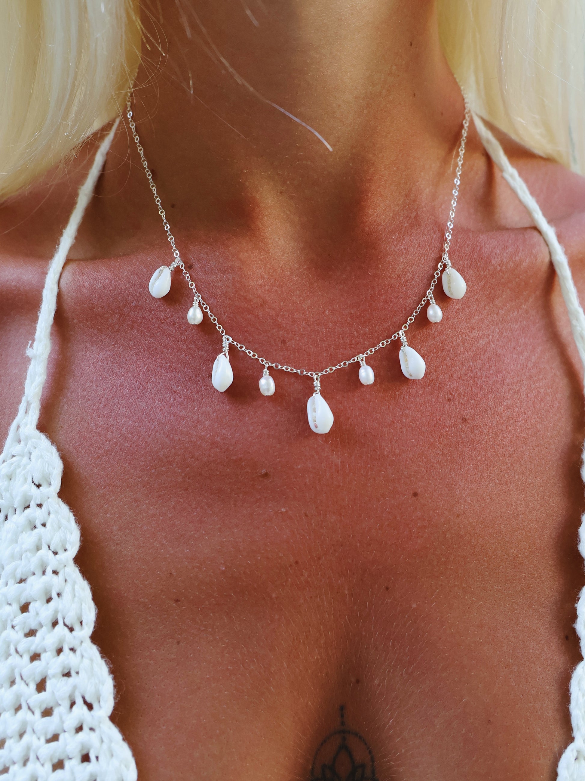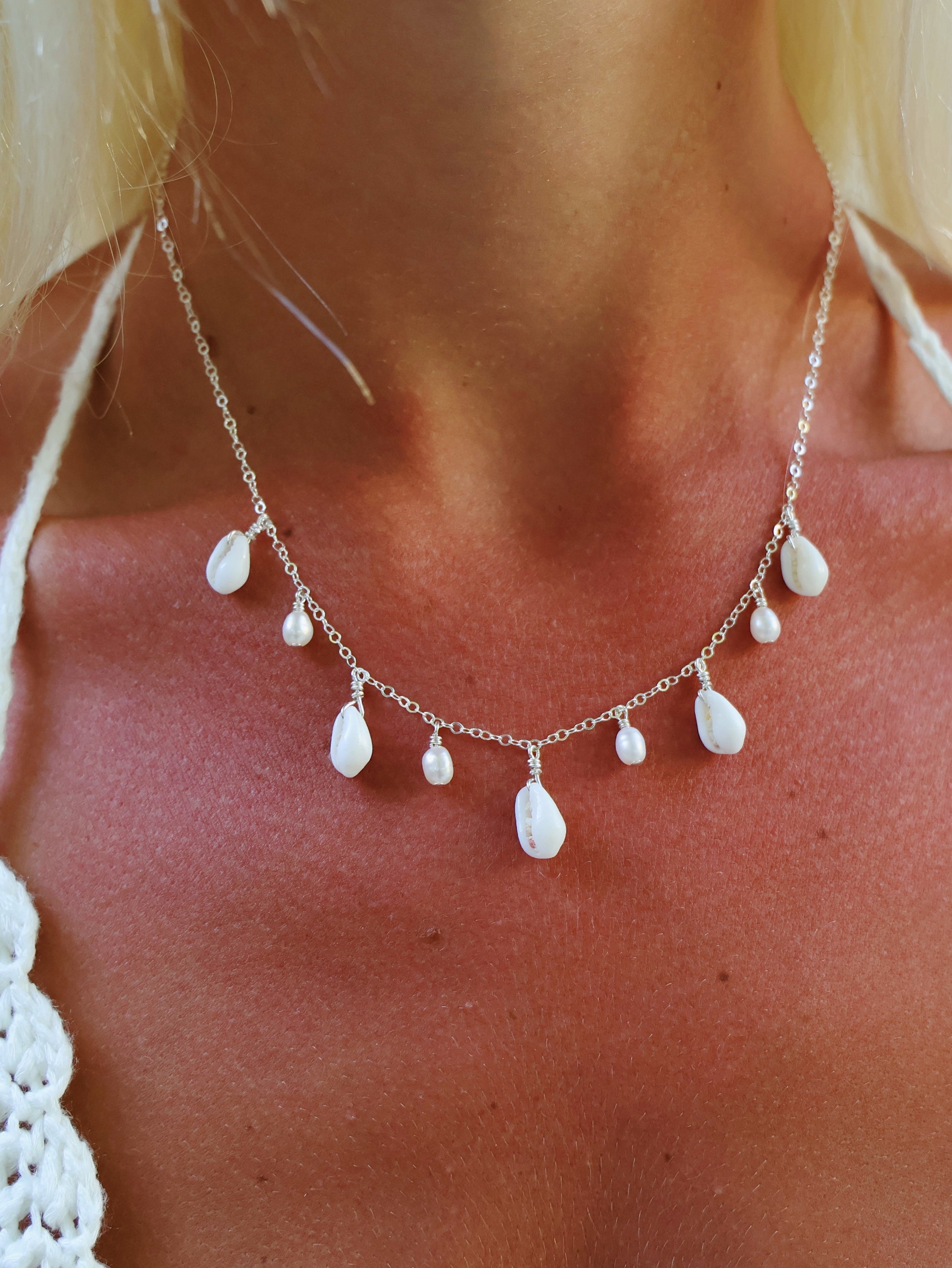 Sterling Silver Full Cowrie Shell Baroque Pearl Multi Necklace
