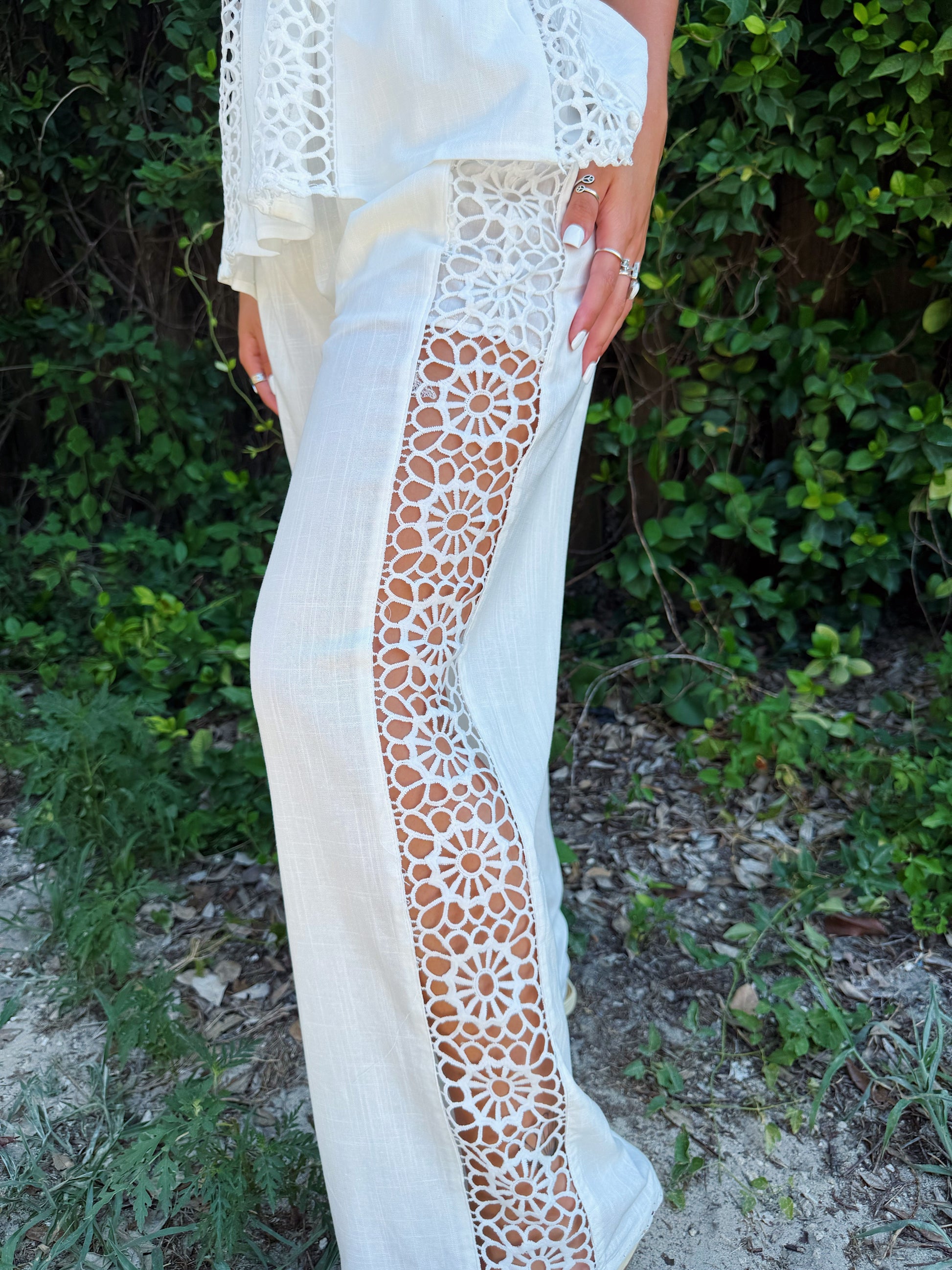 White Boho Crochet Side Wide Leg Pants